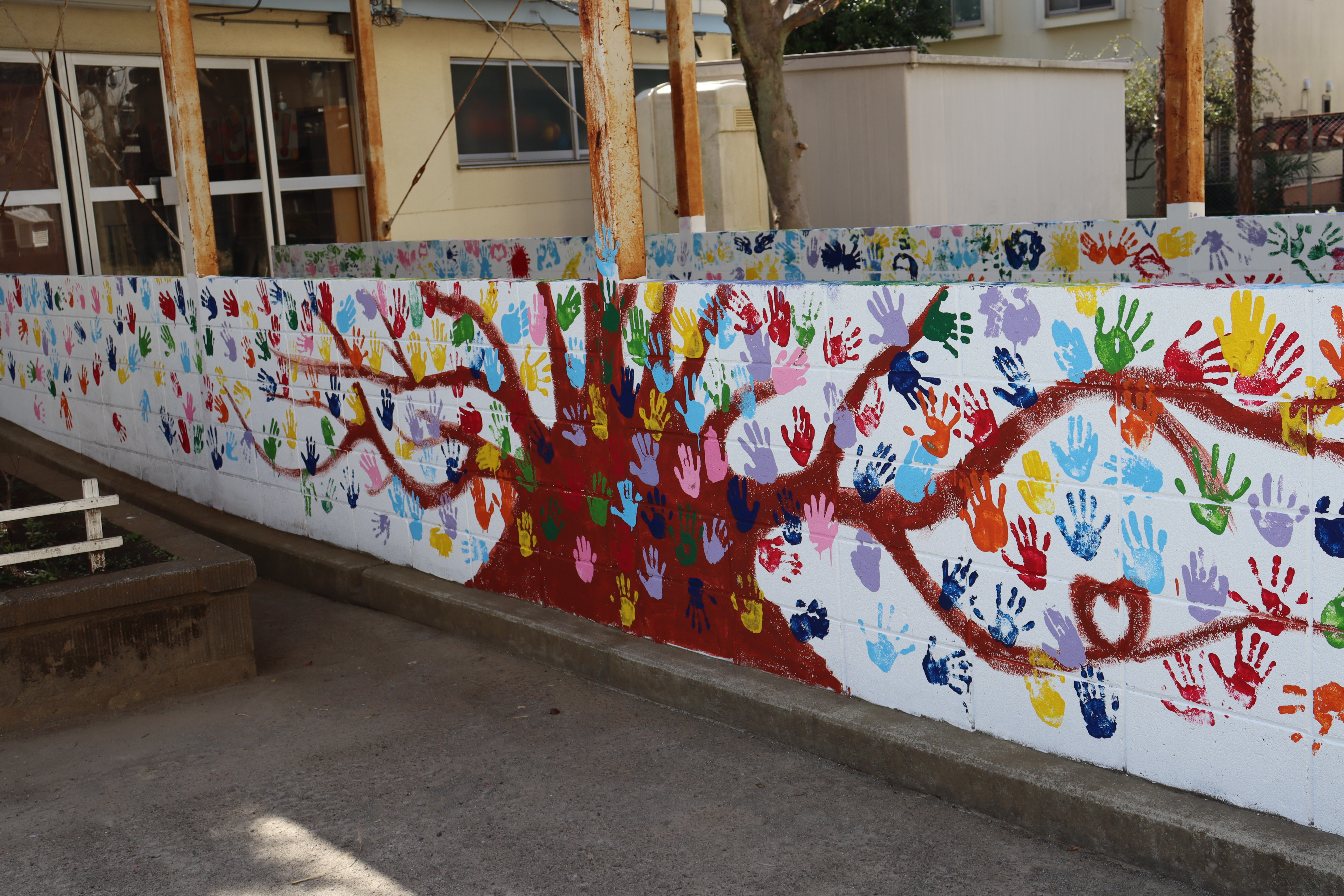 同校は58年の歴史が続く小学校です。児童たちは名残惜しさや寂しさを覚えながらも、好きな色の塗料に手を染め、思いを込めて渡り廊下の内外壁に手形アートを施しました。あらかじめペイントされていた木の幹の図柄に、自由に手形をつけていき、251名の児童たちの手によって、壮大でカラフルな樹木が完成しました。