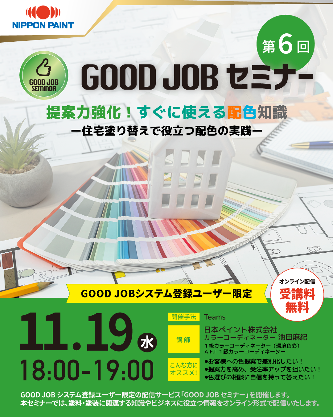 日本ペイント株式会社(本社:東京都品川区、社長:榎本 朋夫、以下、当社)は、「GOOD JOB(グッジョブ)システム」(以下、本システム)において、本システム登録ユーザー限定のセミナー配信サービス「GOOD JOB(グッジョブ)セミナー」(以下、本セミナー)の第6回目を2025年11月19日に開催いたしますのでお知らせします。