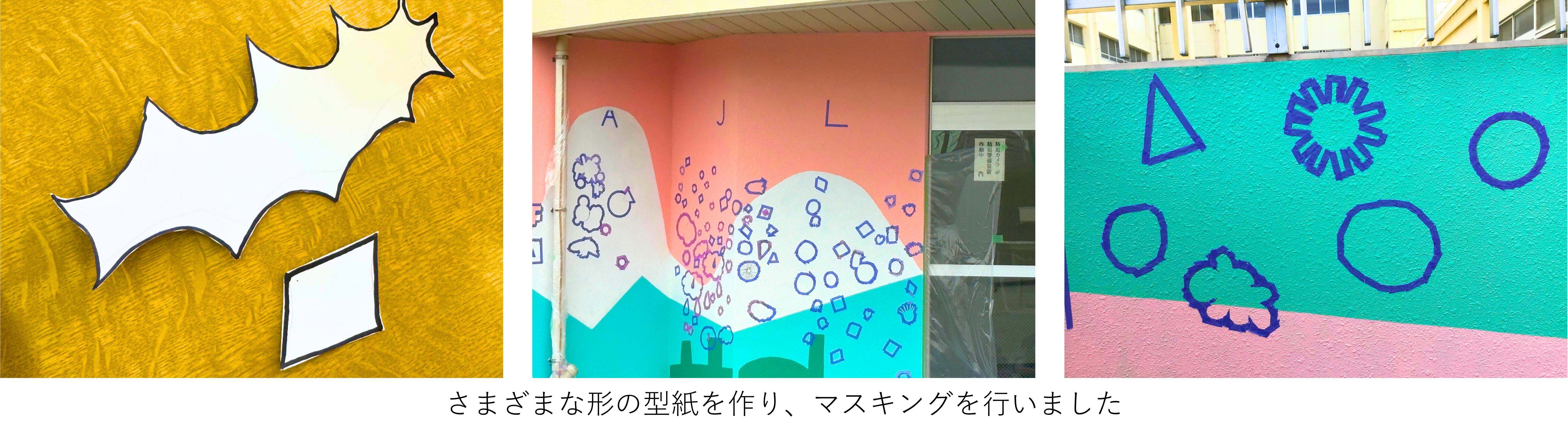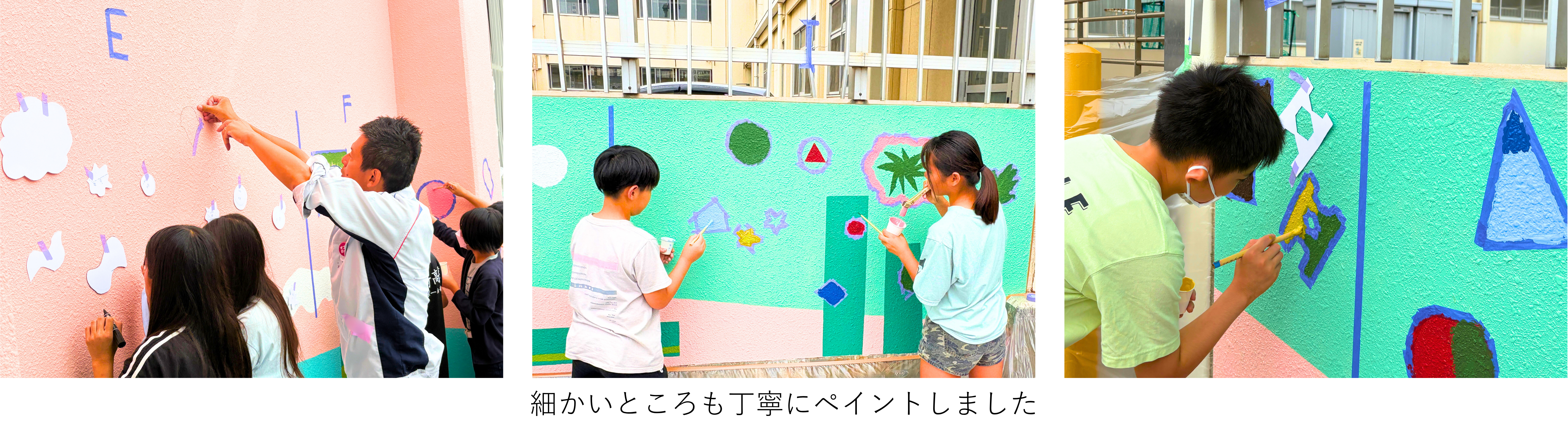 ペイントイベント当日は、児童がモチーフの型紙に沿ってマスキングテープを貼り、本プロジェクトメンバー、当社および同社がサポートしました。その後、5つの味覚(甘い、辛い、酸っぱい、苦い、何だろう)に対応する5色(赤色、水色、黄色、緑色、紫色)を用いてペイントを行いました。児童は複雑な形や細かい箇所を一生懸命にペイントし、匂いを色や形で表現しました。壁面は多様な絵で彩られ、目に見えない学校の匂いの記憶が色鮮やかに表現されました。