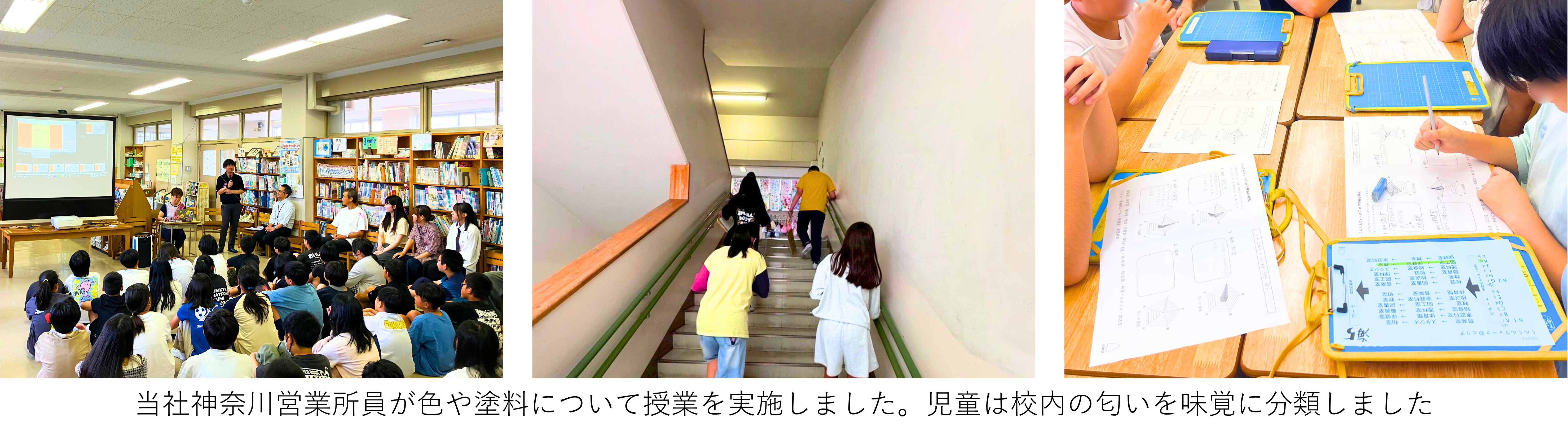 ワークショップ初日には、当社神奈川営業所員が授業を担当し、児童は色や塗料について学習しました。2・3日目では児童が校内のさまざまな場所を巡り、教室や図書館などの匂いを感じ取るワークを行いました。その後、感じた匂いを味覚に分類し、壁画に描くモチーフの形を考えました。ワークショップ期間中には、本プロジェクトメンバーが壁画の下絵を制作し、鶴見区小野町をテーマとした夕日に照らされた工場風景が描かれました。