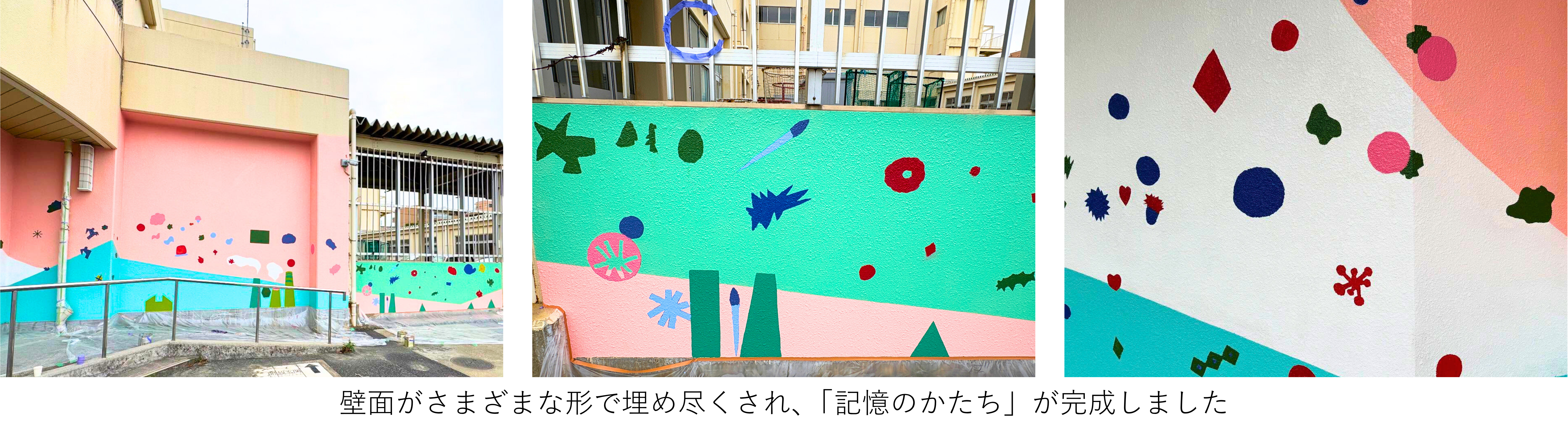 ペイントイベント当日は、児童がモチーフの型紙に沿ってマスキングテープを貼り、本プロジェクトメンバー、当社および同社がサポートしました。その後、5つの味覚(甘い、辛い、酸っぱい、苦い、何だろう)に対応する5色(赤色、水色、黄色、緑色、紫色)を用いてペイントを行いました。児童は複雑な形や細かい箇所を一生懸命にペイントし、匂いを色や形で表現しました。壁面は多様な絵で彩られ、目に見えない学校の匂いの記憶が色鮮やかに表現されました。