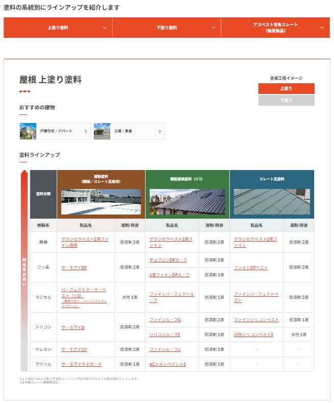 ・各部位のページでは、耐候性などの性能軸で整理した一覧表を掲載しています。一覧表では当社製品のほぼ全てのラインアップをご紹介しており、製品を比較しながらお選びいただけます。