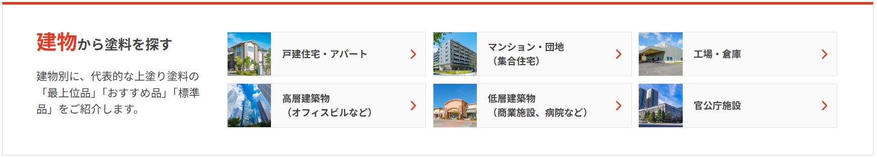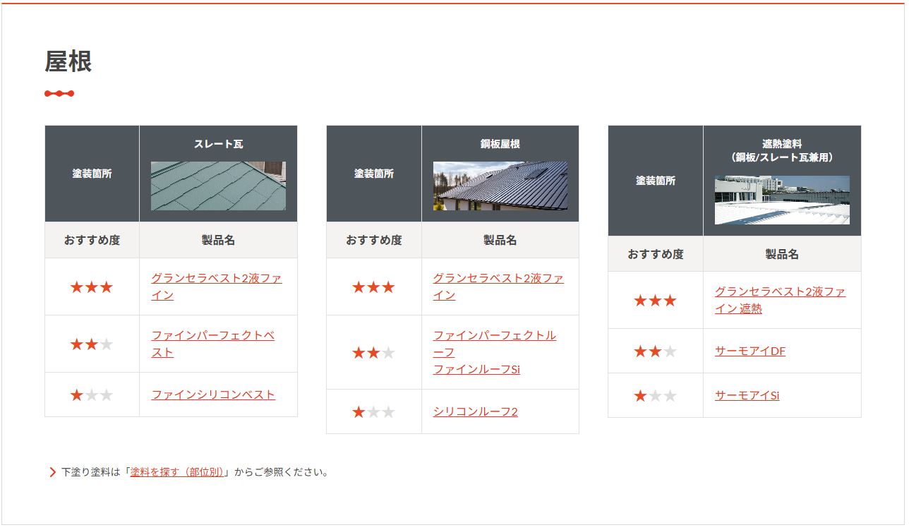 ・各部位の推奨品では、代表的な塗料を「最上位品」「おすすめ品」「標準品」のランクでご紹介しており、目的に合った製品をスムーズにお選びいただけます。