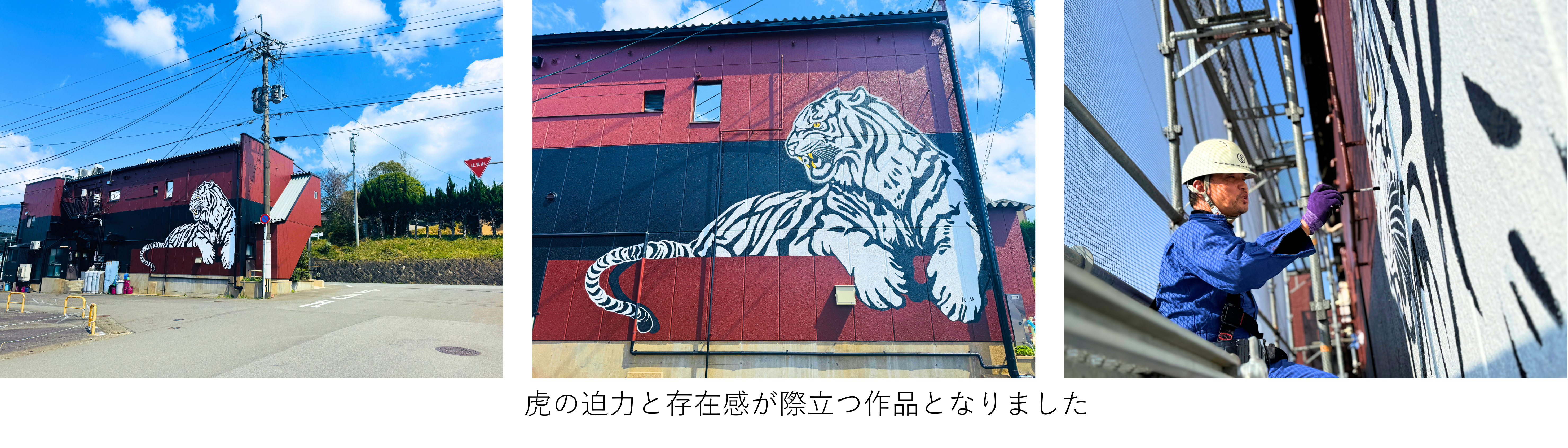 本プロジェクトの実行委員会メンバーでもある牛丸和人氏によって、店名の由来でもあるアムール虎が描かれました。壁面のキャンバスを活かしつつ、あえて色数を抑えることで、虎の迫力と存在感が際立つ作品に仕上がっています。多久の街を見守る番人のように、地域から愛されるアイコンとなっています。