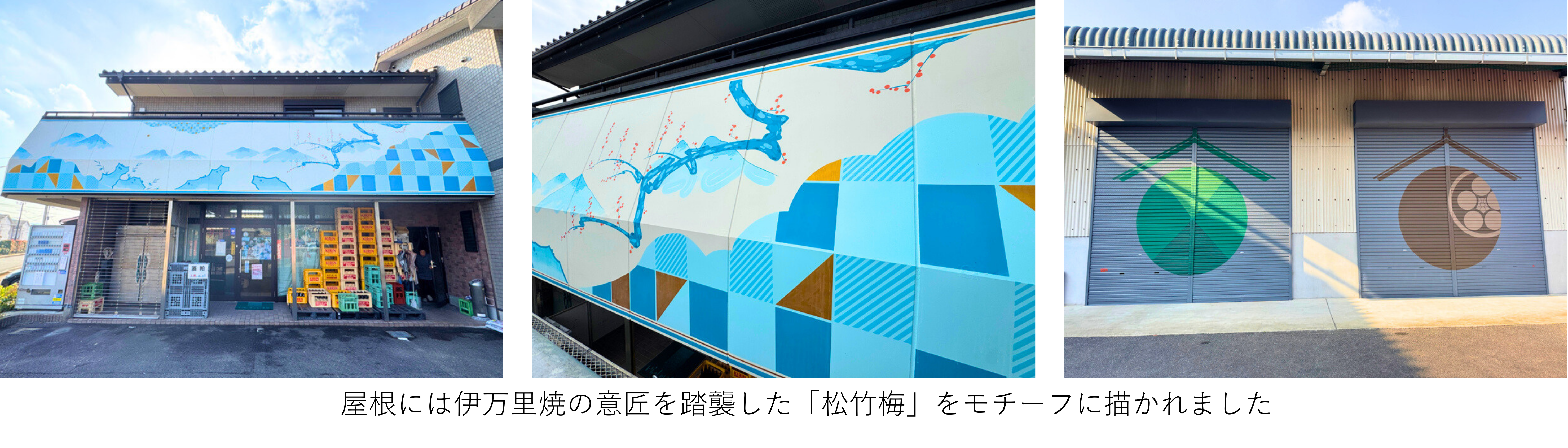 概要:中田酒店は昭和48年(1973年)創業で、約半世紀にわたり地元の飲食店などへお酒を卸してきました。当初、KONIROW氏とEnter氏からは、お酒の原材料である稲穂を中心に、流れるような構図のラフ案をご提示いただいていました。しかし、現地の視察や多久聖廟の訪問、地域の方々との交流を重ねる中で発想が広がり、最終的にシャッターには日本酒造りに欠かせない「杉玉」をモチーフとして、家紋や幾何学模様をあしらったデザインになりました。さらに屋根部分には、伊万里焼の意匠を踏襲した「松竹梅」に加え、太陽や満月などが蒔絵のように左から右へ流れる構成で描かれました。