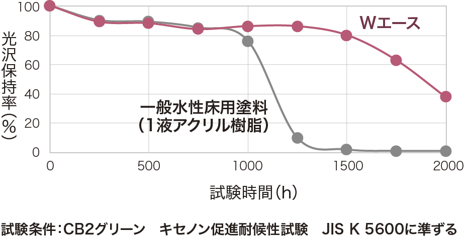 Wエースつや有と一般水性床用塗料の耐候性試験結果