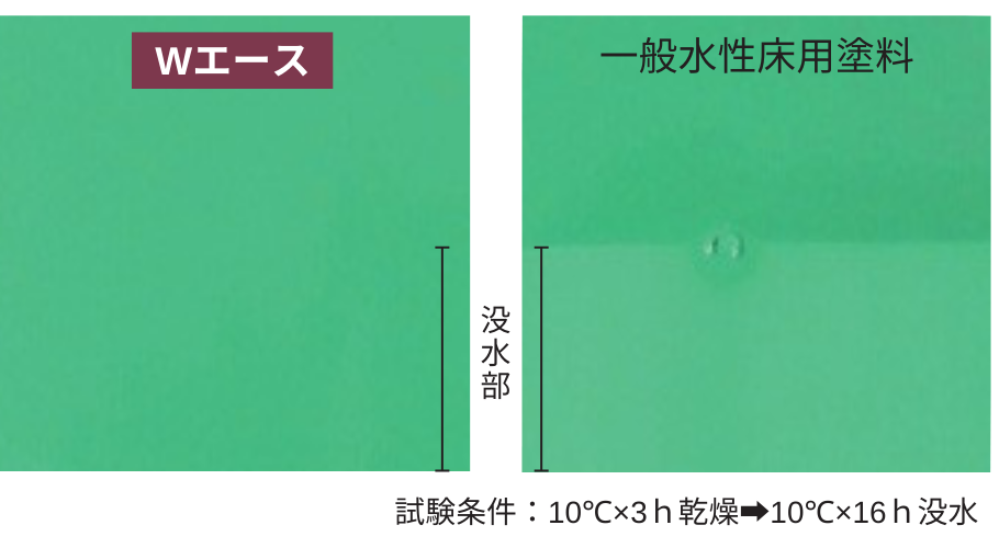 Wエースつや有と一般水性床用塗料の低温初期耐水性の試験結果
