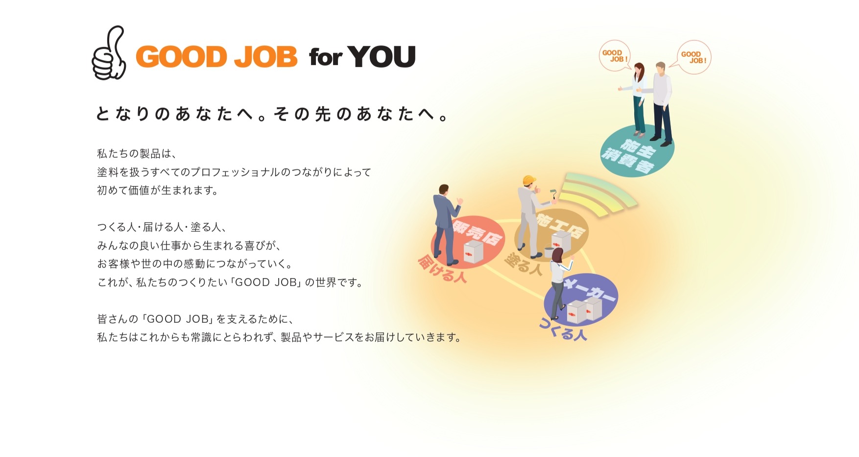 ※GOOD JOBシステムのご利用には、お取引のある塗料販売店様が本システムをご利用されている必要がございます。また、当社商品をお取り扱いいただいている塗料販売店様であっても、本システムをご利用されていない場合がございますのでご了承ください。