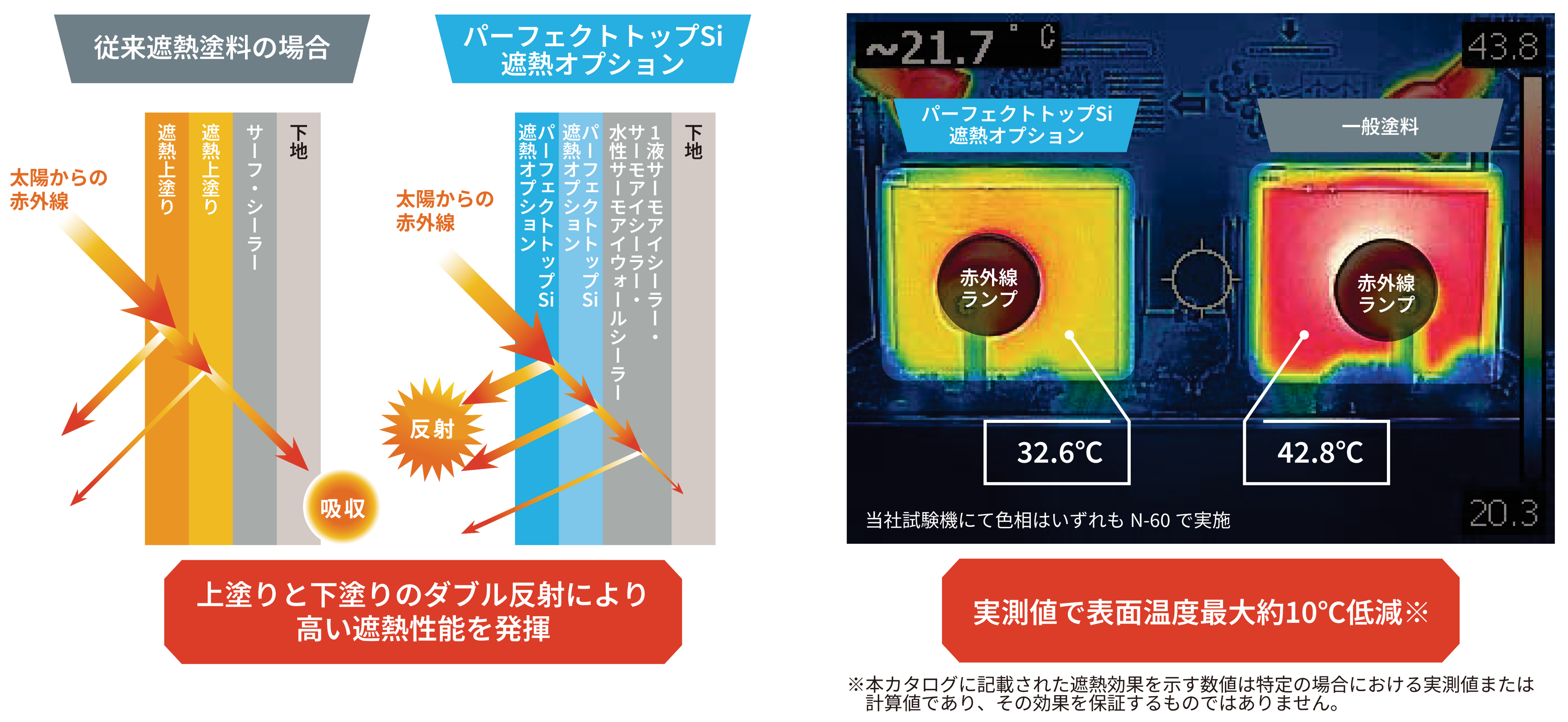 本製品には、当社の遮熱塗料ブランド「サーモアイシリーズ」で培った遮熱技術「ダブル反射・赤外線透過テクノロジー」を採用しています。これにより、上塗りと下塗りの遮熱効果を最大限に引き出し、室内温度低下やエアコンの温度設定緩和による電気代の削減に貢献します。